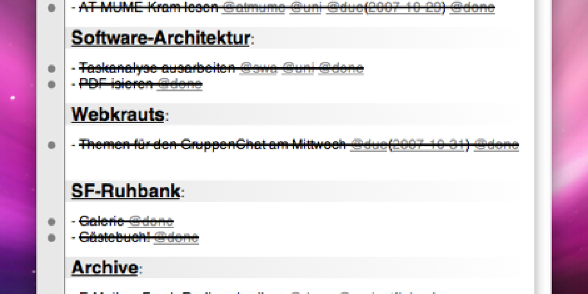 Was für mich noch fehlt, ist die Anbindung an iCal. Ich benutze schon das Format: @due(2007-10-29), welches irgendwann eventuell diese Funktion übernehmen könnte. Es gibt zumindest Pläne dieses Format zu benutzen.